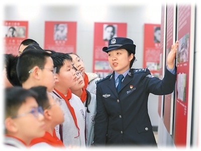江苏边检总站江阴边检站联合江阴市英桥中心小学开展“清明祭先烈 共铸中华魂”主题活动。图为在革命烈士纪念馆内,民警向学生们讲述革命英烈事迹。 程 俊摄(人民图片)