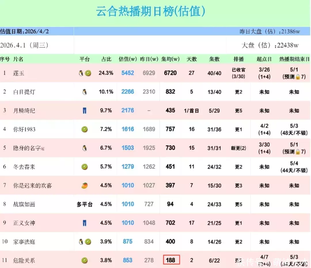 线上成绩方面,《危险关系》由桃厂独播。在今年桃厂热度如此发大水的情况下,该剧的热度却涨幅依旧不大,开播时热度为5186,目前的热度峰值是6841。开播前两天的集均播放量还不到200万,之后的走势也十分不妙,最后的集均成绩能不能突破1500万都是问题。
