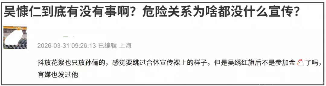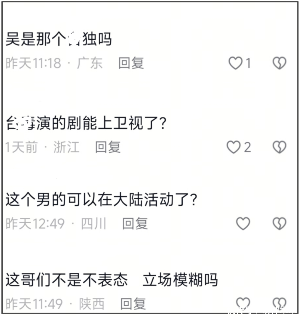 哪怕现在《危险关系》尽量低调地上线了,但是观众抵制的声音依旧存在,官方账号中为数不多的男主片段视频评论区都会出现质疑的声音,比起讨论剧集相关内容和演技,大家更关注吴慷仁的立场问题,质问他凭什么能在大陆活动,他演的剧凭什么能在卫视上星播出。