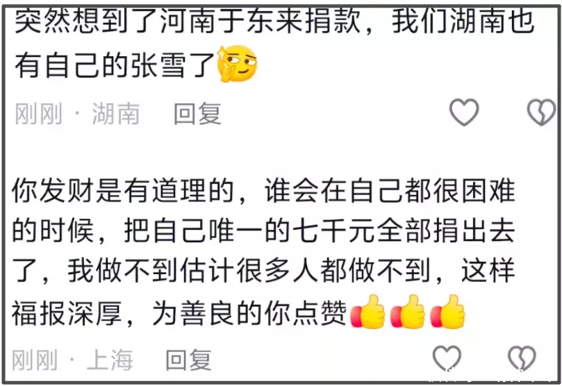 某种程度上,张雪挺冲动的,他觉得反正几千块不够自己走出低谷,不如给需要的人,也许能救对方一命,非常朴素的善恶观,但不具备普遍性,毕竟大家都是普通人,做慈善都要量力而为,评论区还有网友觉得,张雪之所以能成功,就是因为太善了。