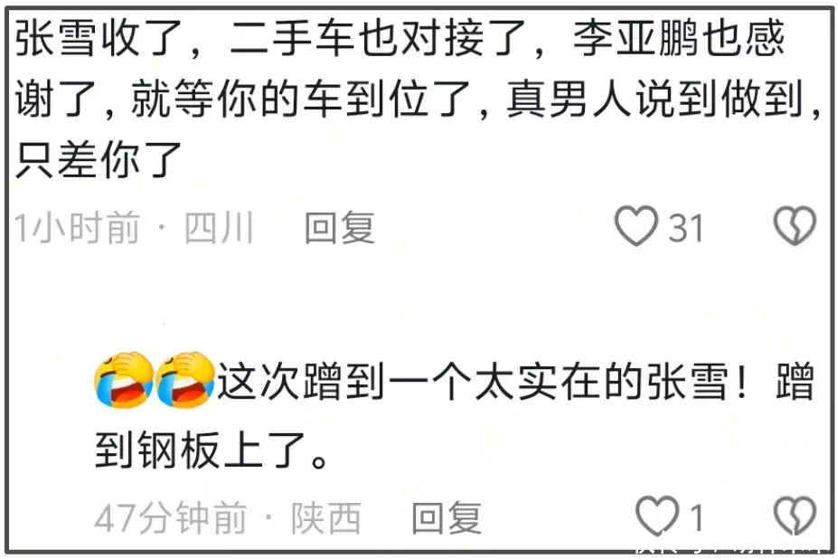 另一边,张雪和李亚鹏倒是你一个直播我一个视频,不管陈光标豪车捐赠到位不到位,张雪反正要把比赛车辆的复刻版拍卖所得款项都捐给嫣然基金。